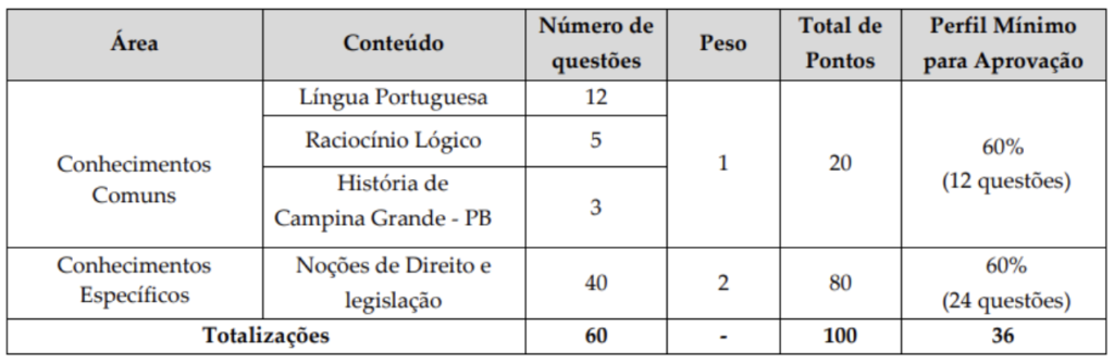 As provas objetivas do concurso GCM Campina Grande foram de questões de múltipla escolha, com quatro opções de resposta, conforme quadro abaixo.