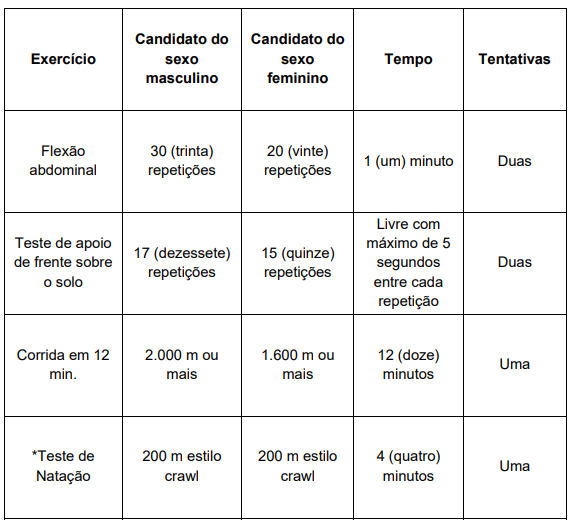 Avançavam ao TAF os candidatos classificados até o triplo das vagas ofertadas. O teste físico incluía flexão abdominal, apoio de frente sobre o solo, corrida de 12 minutos e natação em estilo crawl, com índices mínimos específicos para candidatos masculinos e femininos. Veja: